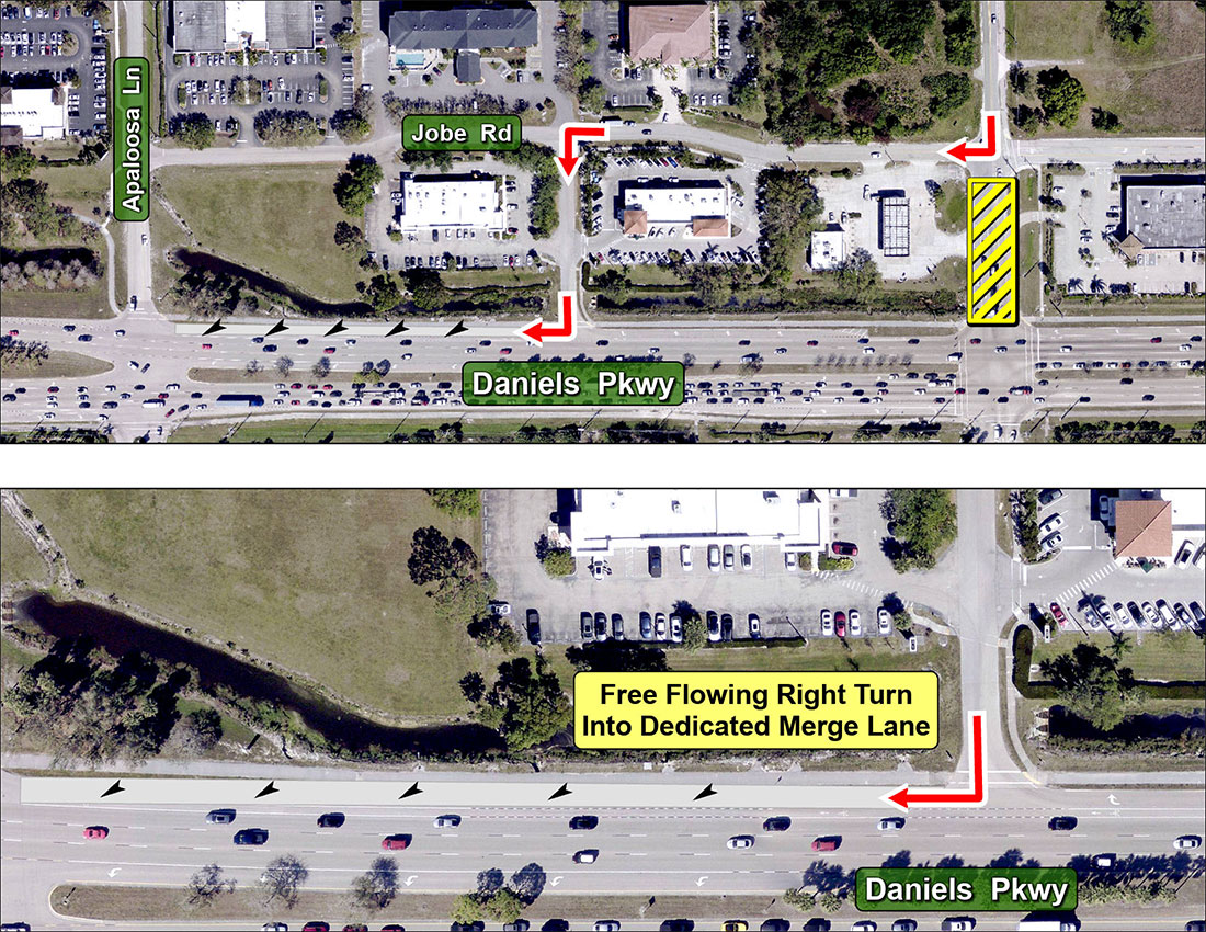 - In addition, the Frontage Road east of Apaloosa Lane will have a right turn lane to westbound Daniels Parkway via a temporary merge lane for westbound traffic. This allows Palomino traffic destined for westbound Daniels to use the frontage road that connects to Jobe Road to Daniels to safely make right turns onto Daniels Parkway under nearly free flow conditions.